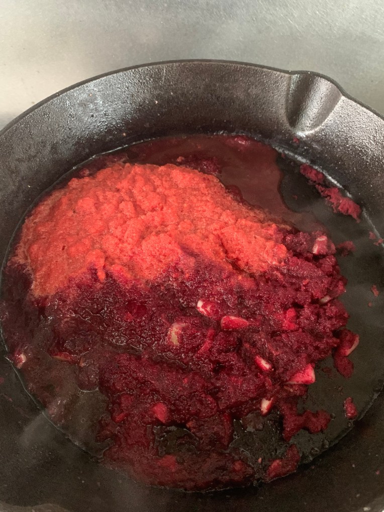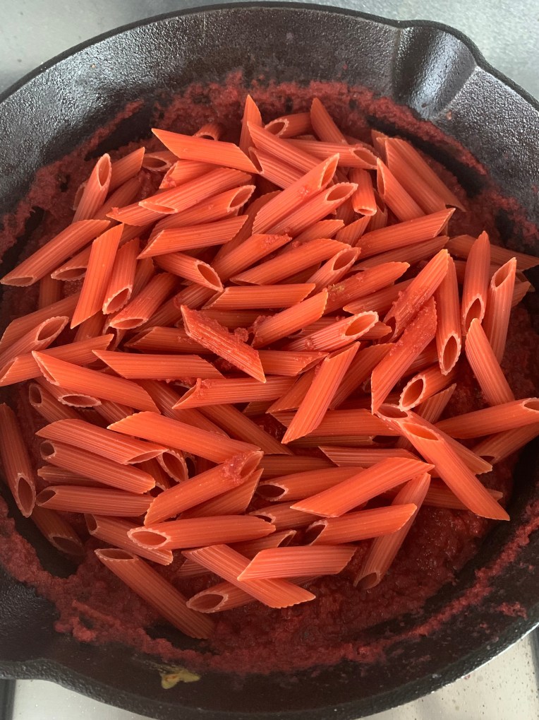 Heat ghee. Add garlic. Add carrot beetroot puree. Cook for 5 min. Add Iyurved’s Daily Nutrition savoury spread (order here). Add pasta sauce and seasonings. Cook for another 5 min. Add pasta and water. Cover and cook till soft. (What are the health benefits of beetroot?)