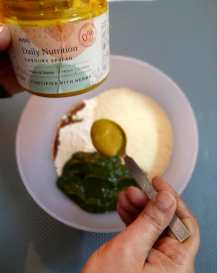 - 2 tbsp Iyurved Daily Nutrition Savoury Spread (order here) and 1 tbsp of Iyurved Daily nutrition Veggies and Dal powder (order here)