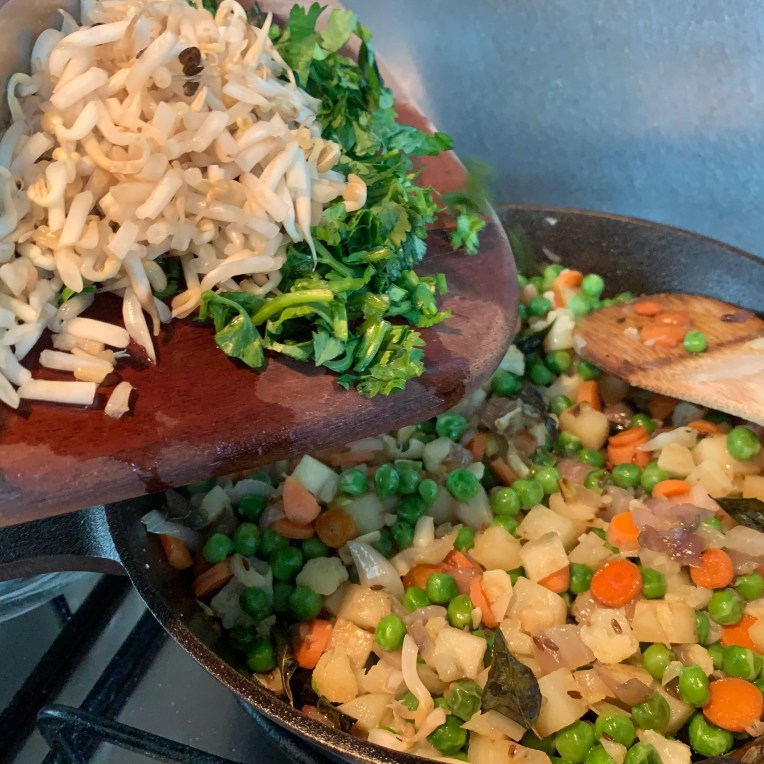 - Add chopped mung bean sprouts and coriander