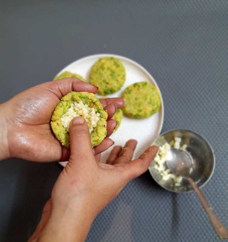 Coarsely grind chickpea and pea in mixer. put them in bowl. Add gram flour , chili flakes, oregano, grated ginger-garlic and salt. Put Iyurved’s daily Nutrition Savoury Spread (order here) Mix all the ingredients well. Take small balls, roll it out lightly. Place the cheese filling and seal it on top. Roll it evenly and flatten them to give kabab shape. Air fry or shallow fry or deep fry the kababs. Healthy and nutritious Snacks are ready to serve!!!